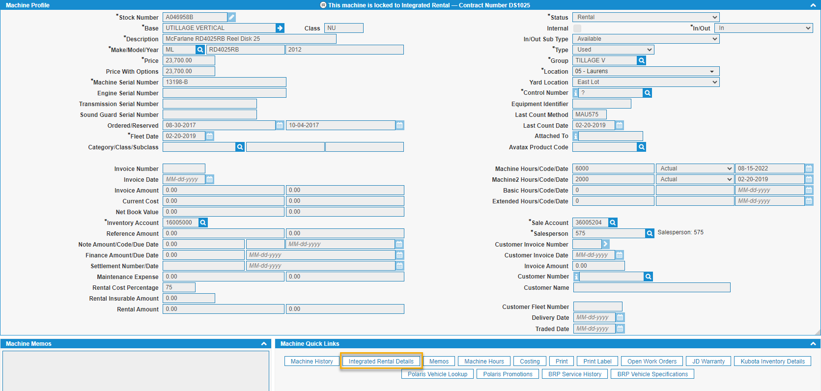 Units controlled by Integrated Rental are locked so that certain values cannot be updated within IntelliDealer. The units locked by Integrated Rental Units are those that have a rental status, such as agreement. Presold and on order equipment is never locked. When a unit is locked to Integrated Rental, an alert is shown in the equipment profile (Product Support > Equipment > Equipment Profile).