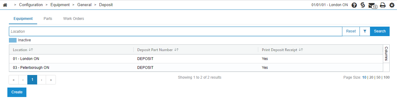 Verify that your location is listed. If your location is not listed, click Create to add it. See Deposit: Equipment and Work Orders.