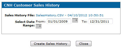 | Sales History File | Displays the name of the file along with the last date and time the customer sales history was generated. Clicking the hyperlinked SalesHistory.CSV file name allows you to save or view the file on your local PC. Once saved, you can submit the file to CNH. |