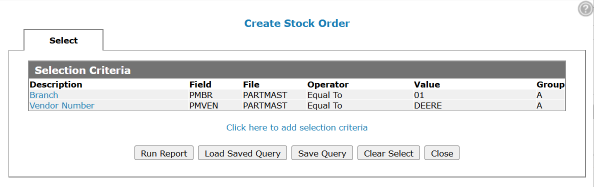 The Selection Criteria screen opens.