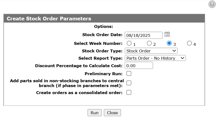 On the Parts Ordering screen click Ordering Options > Create Stock Order.