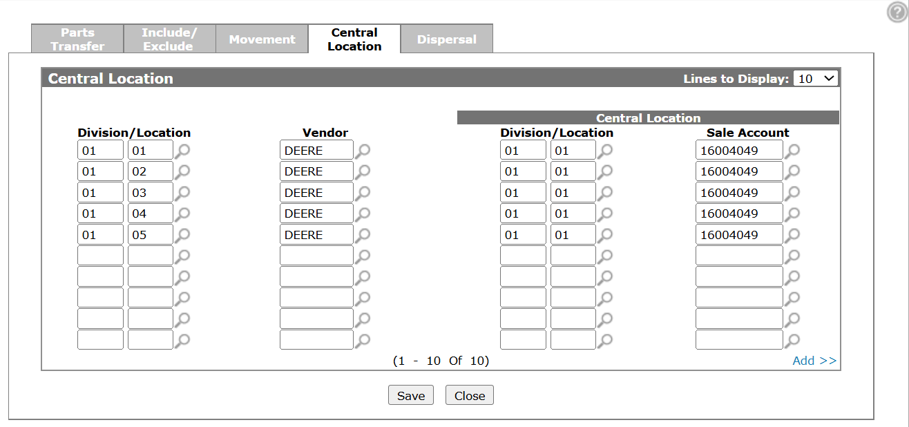 Use this page to set up dispersal of corporate inventory to the location with the highest demand. Parts Dispersal is similar to Parts Central Inventory, except that the central order is not created in the Central Location. Instead, it is split up and dispersed to the locations that are configured to use the Central Location. The orders are generated through the Create Stock Order process the same way that a central order is created.