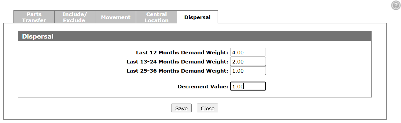 On the Dispersal tab, set the demand weighting per time frame and a decrement value. These values are used to generate a point total for each location based on the demands of the part. The location with the highest point total gets the dispersed part.