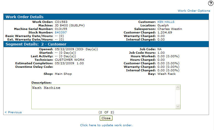 The labor charges are applied to the work order number or repair sequence number that appears in this field. Click the link to view the Work Order Details. |
