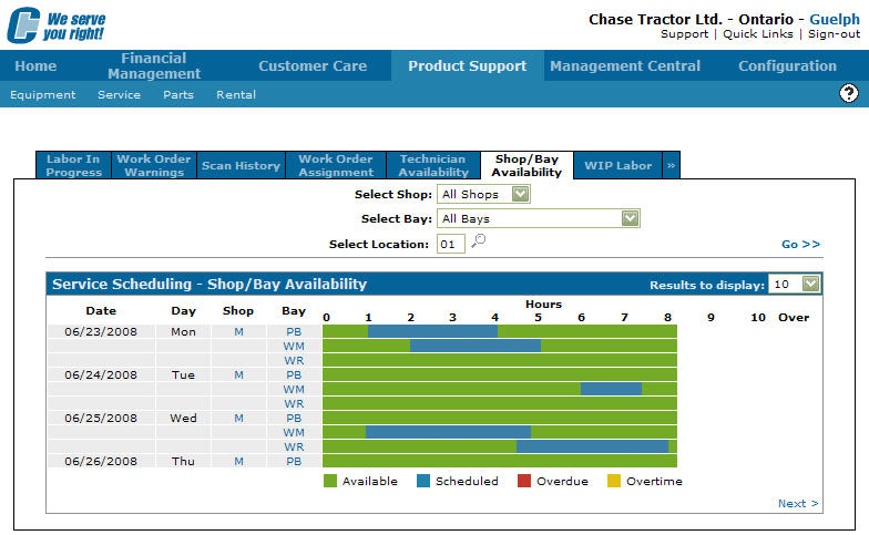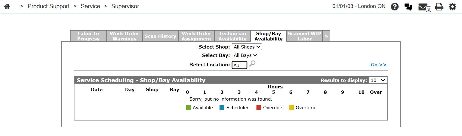 The Service Scheduling - Shop/Bay Availability tab will appear.Service Scheduling - Shop/Bay Availability tab