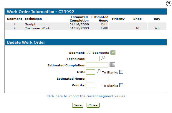 Note: Click on the Click here to import the current segment values link to update the Segment, Technician, Estimated Completion, and Estimated Hours field values import information from the corresponding work order segment.