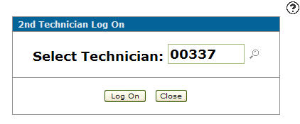 icon next to the Select Technician field to search for and select a technician number.The 2nd Technician Log On screen appears with the selected technician number in the Select Technician field.