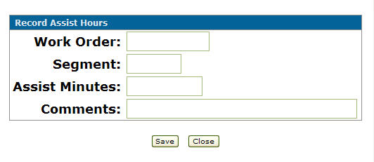 | Close | Closes the Record Assist Hours screen without saving and returns to the Logged on screen. |