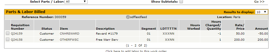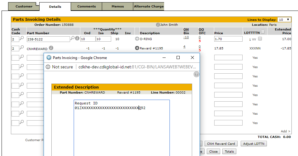 - If the reward card is accepted by CNH, the CNH Reward part will be added to the invoice. The last four digits will be in the description and the request id will be added to the long description.