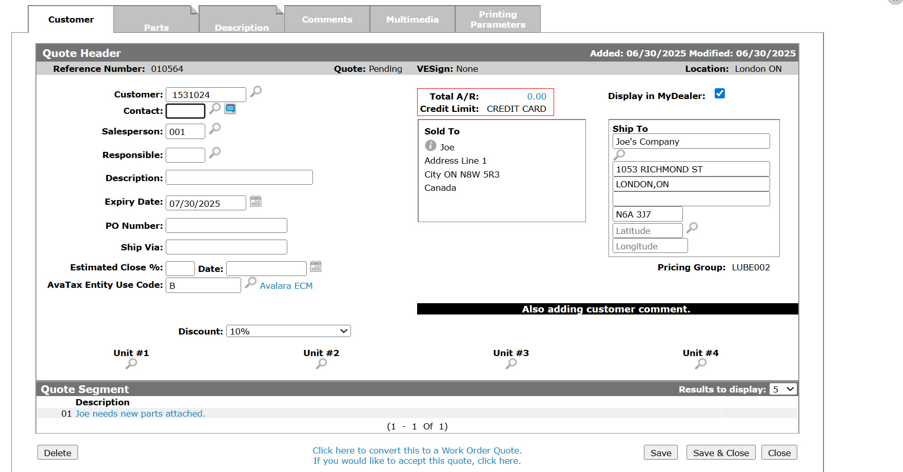 Accepting a Parts Quote