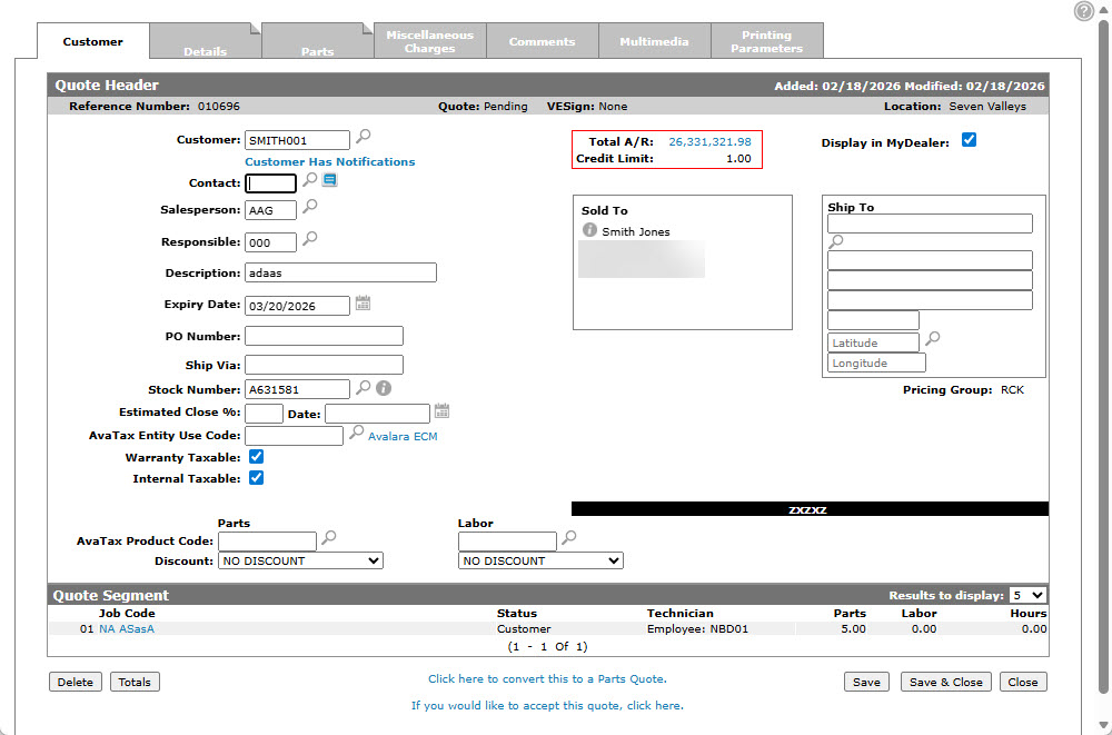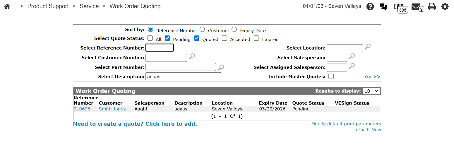 The converted quote retains its Reference Number, but is listed on the Parts Quoting screen instead of the Work Order Quoting screen.