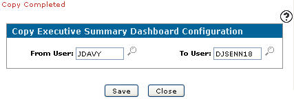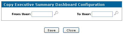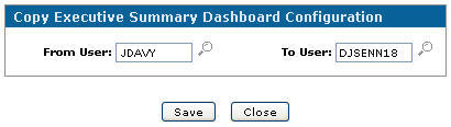 The Copy Executive Summary Dashboard Configuration screen will appear with the selected user in the From User field.Copy Executive Summary Dashboard Configuration screen