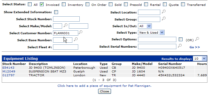 This will link you out to the equipment search screen, with the customers number already filled in. Hit the 'GO' button from here: