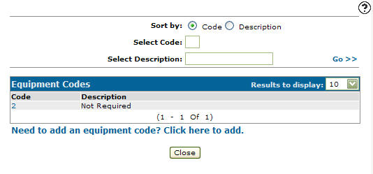 On the Equipment Codes screen, fill out the appropriate fields and click the Go >> link.