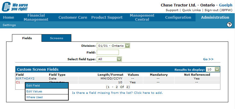 On the Custom Screen Field tab, move the cursor over a Field and select Edit Fields from the list.