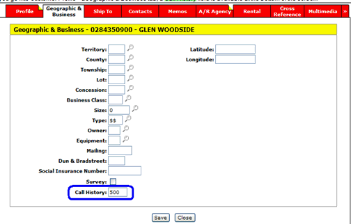 If you go into Customer Profile - Geographic & Business tab, a Call History field is available at the bottom of the screen.