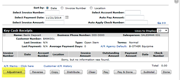 In Cash Receipts bring up your Bank Deposit customer. Select the ADJUSTMENT option