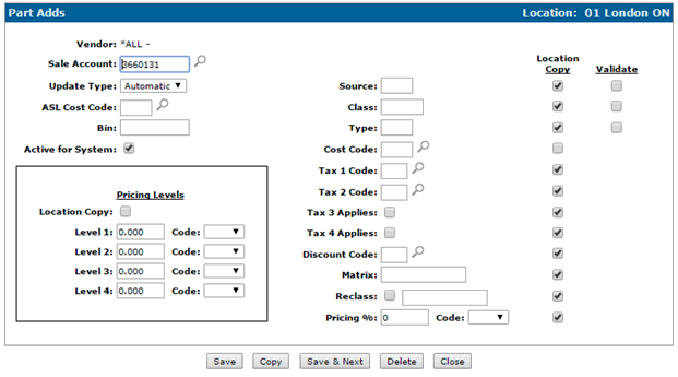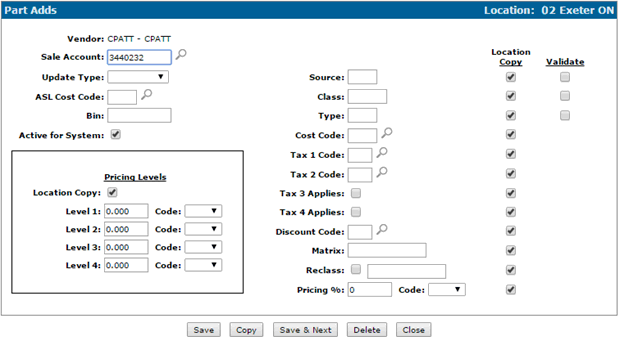 For steps 6 and 7: Note: If the Price Increase Code/Percent switch on the PartAdds table is set to Branch Copy, then even if the Pricing Percent on the branch being copied is zero, the zero will be retained and not defaulted from PartAdd. |