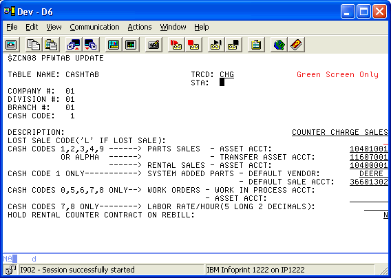 | 10. If the sale account is blank and the vendor is not blank, assign the sale account loaded in the "SYSTEM ADDED PARTS - DEFAULT SALE ACCT:" field in the CASHTAB table for cash code "1". | CASHTAB |