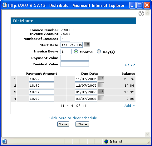 The Distribute screen allows one invoice to be split into more than one invoice. Invoice dates can be specified, and invoice amounts can be either dollar amounts, or a percentage of the total.