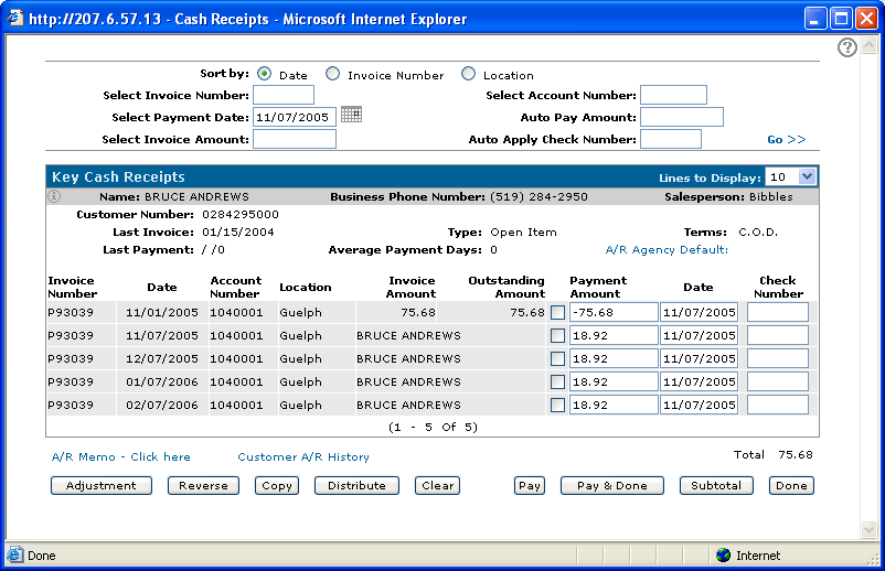 While in a cash receipts batch, select the invoice(s) in question with a check mark and click on the Distribute button. The following screen will appear: