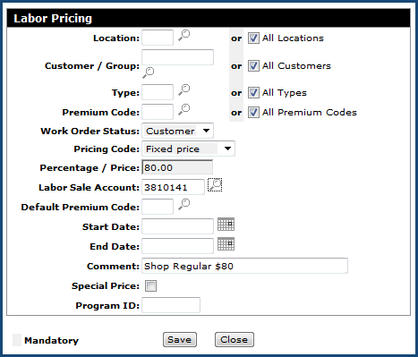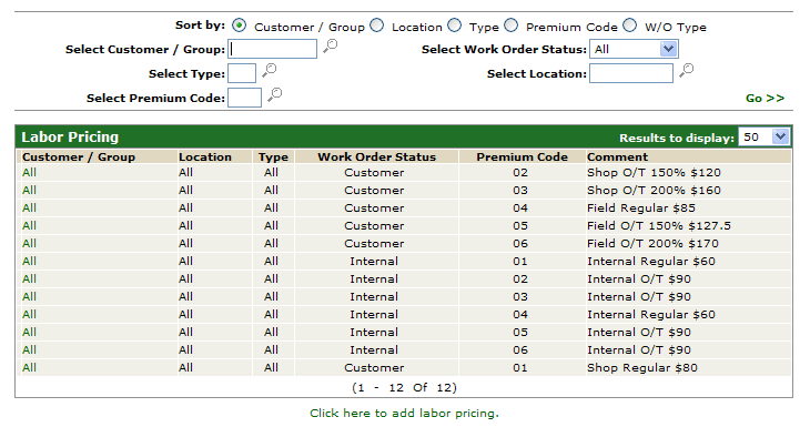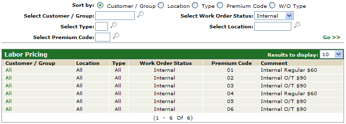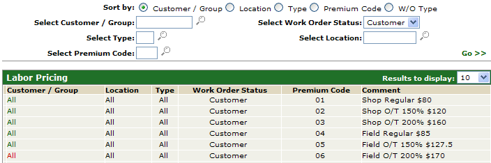 Labor Pricing allows labor rates to be configured based on a variety of factors such as location, customer#, W/O type, W/O status, or premium code, and is similar to the parts customer discount system.