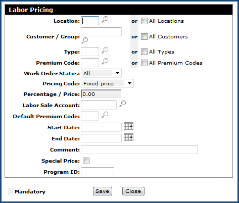 Start Date and End Date: Determines the time period this labor pricing will be in effect. Keyed in the MMDDCCYY format.