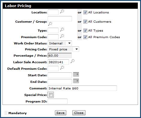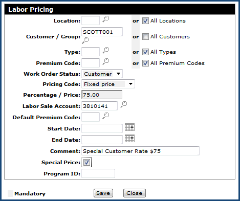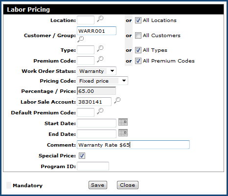 Note: The special price option is a good idea here because you don't want any other overlapping labor rates that happen to be a lower price to be used. When selecting "Special Price" the system will use this price regardless. Also note that Work Order Status is set to All - the reason is to cover the possibility that the user creating the work order might inadvertently choose an incorrect Work Order Status when creating a Warranty Work Order (i.e. leaving the work order as Status Active or Customer). This may happen from time to time, but if it does, the correct labor price will still be used, because this Labor Pricing record is set-up based on the Customer.