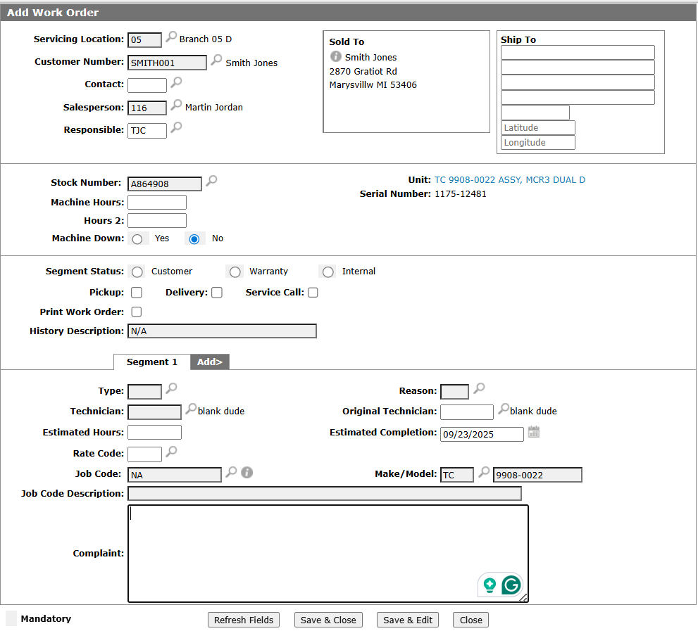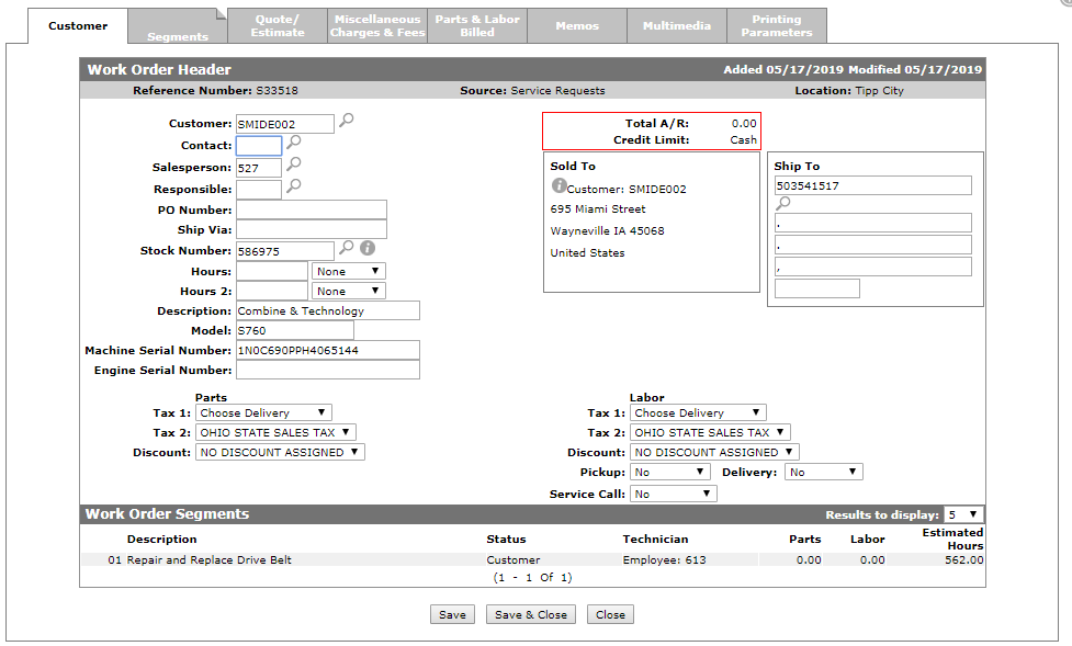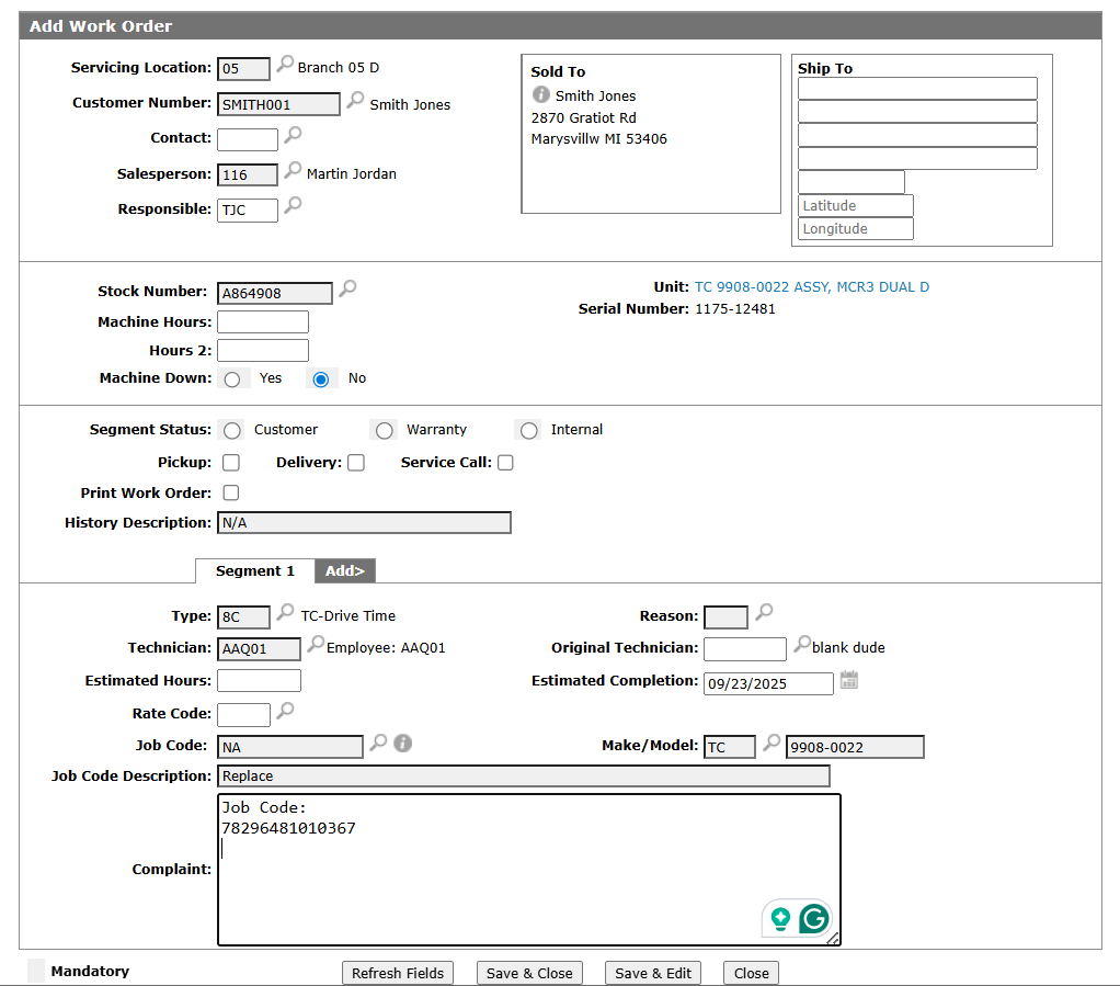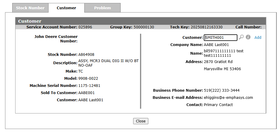 Once the stock number has been assigned, the user can click on the Customer tab to assign the customer number. The customer number may already be assigned if the EAD customer number (John Deere's CKC ID) is already matched to IntelliDealer customer number. If not, the user must search for and assign the customer number using the magnifying glass or add the customer using the Add link to the right of the magnifying glass. Once an IntelliDealer customer number is assigned to an EAD Service Request, the CKC ID on that request is linked to the IntelliDealer customer number. This means that the next time an EAD Service Request comes in, the IntelliDealer number should already be assigned. So over time as these linkages are built users should find they do not have to search for and assign the IntelliDealer customer and rather they are automatically assigned.