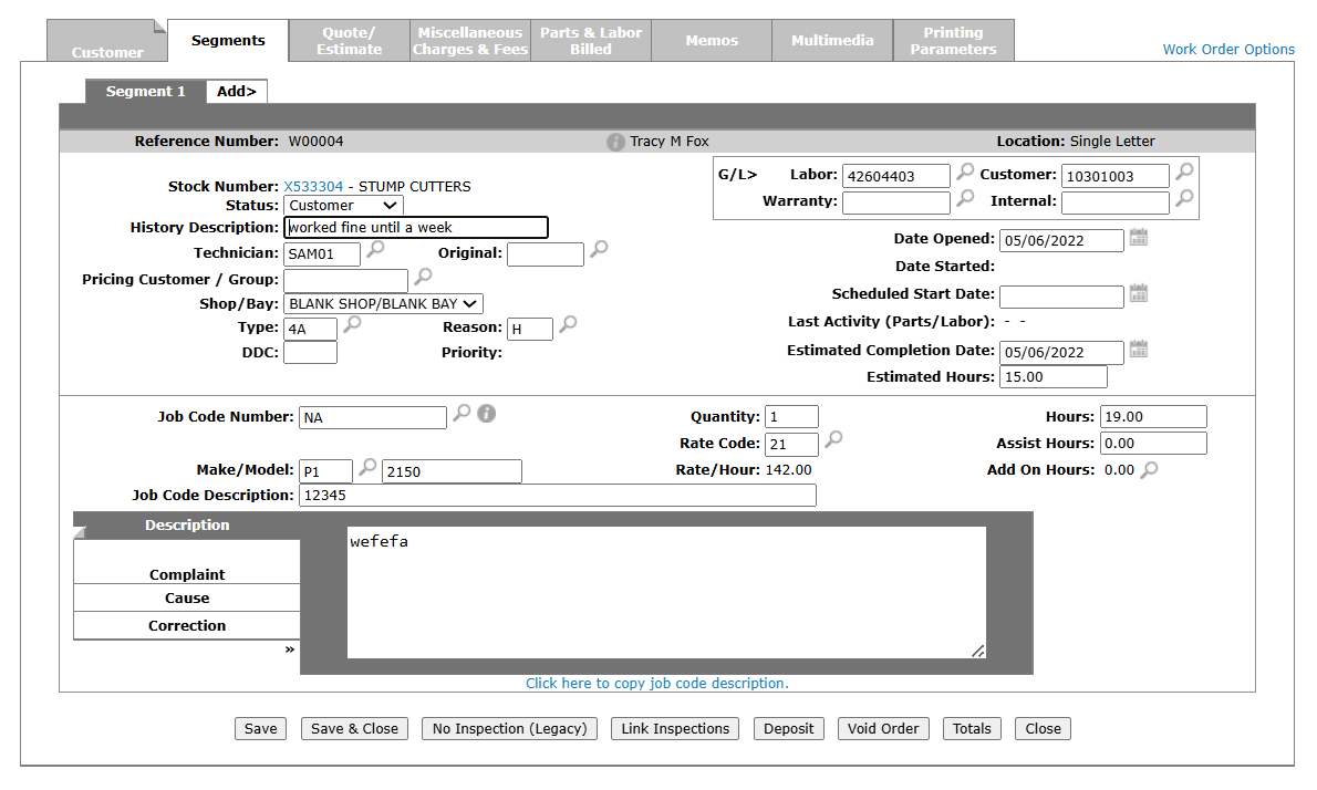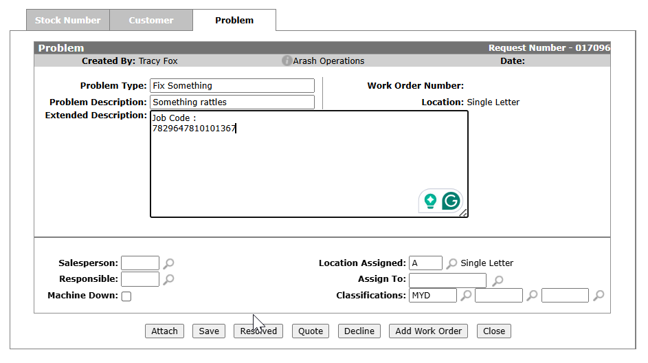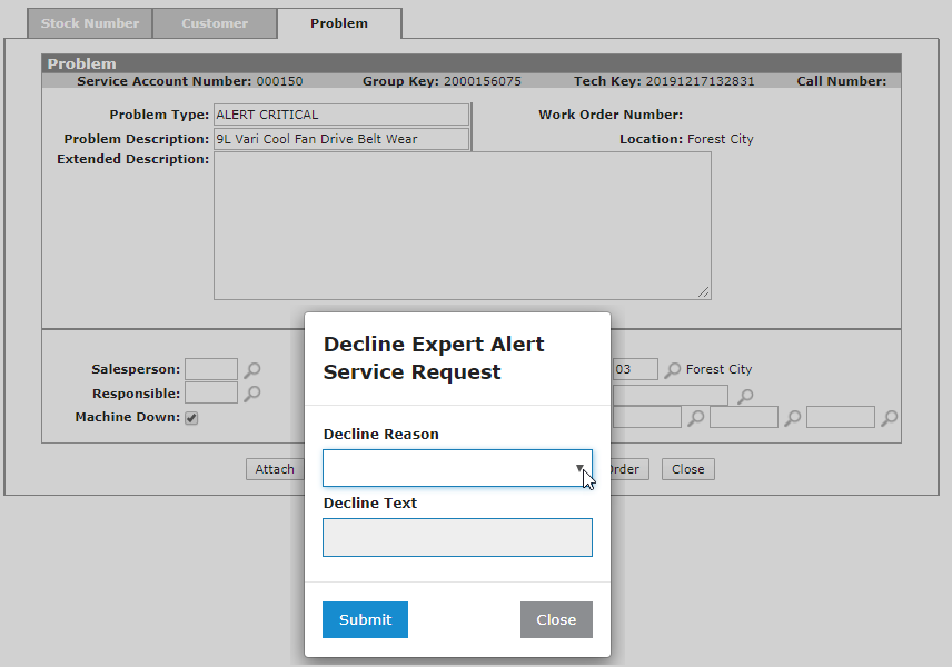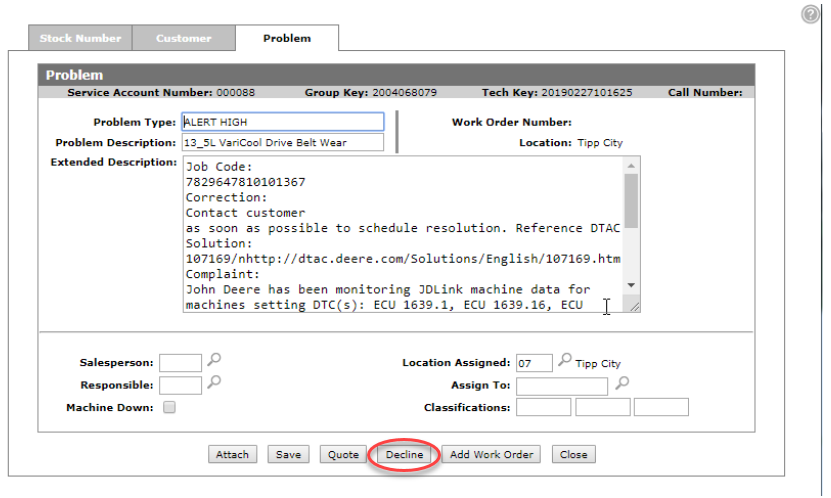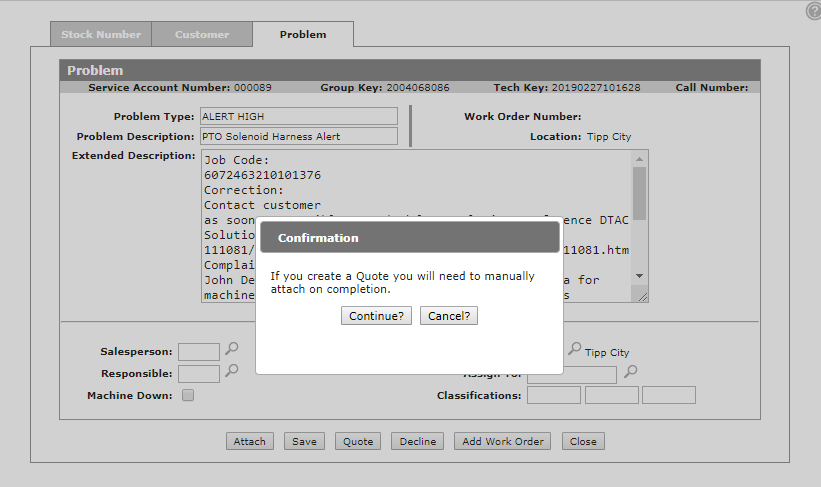 - Quote: The user can convert the Service Request to a Quote. The user must attach the work order created from the quote to the Service Request using the "Attach" button in order to update the Expert Alert and DTC system at John Deere that the work was done for that EAD.