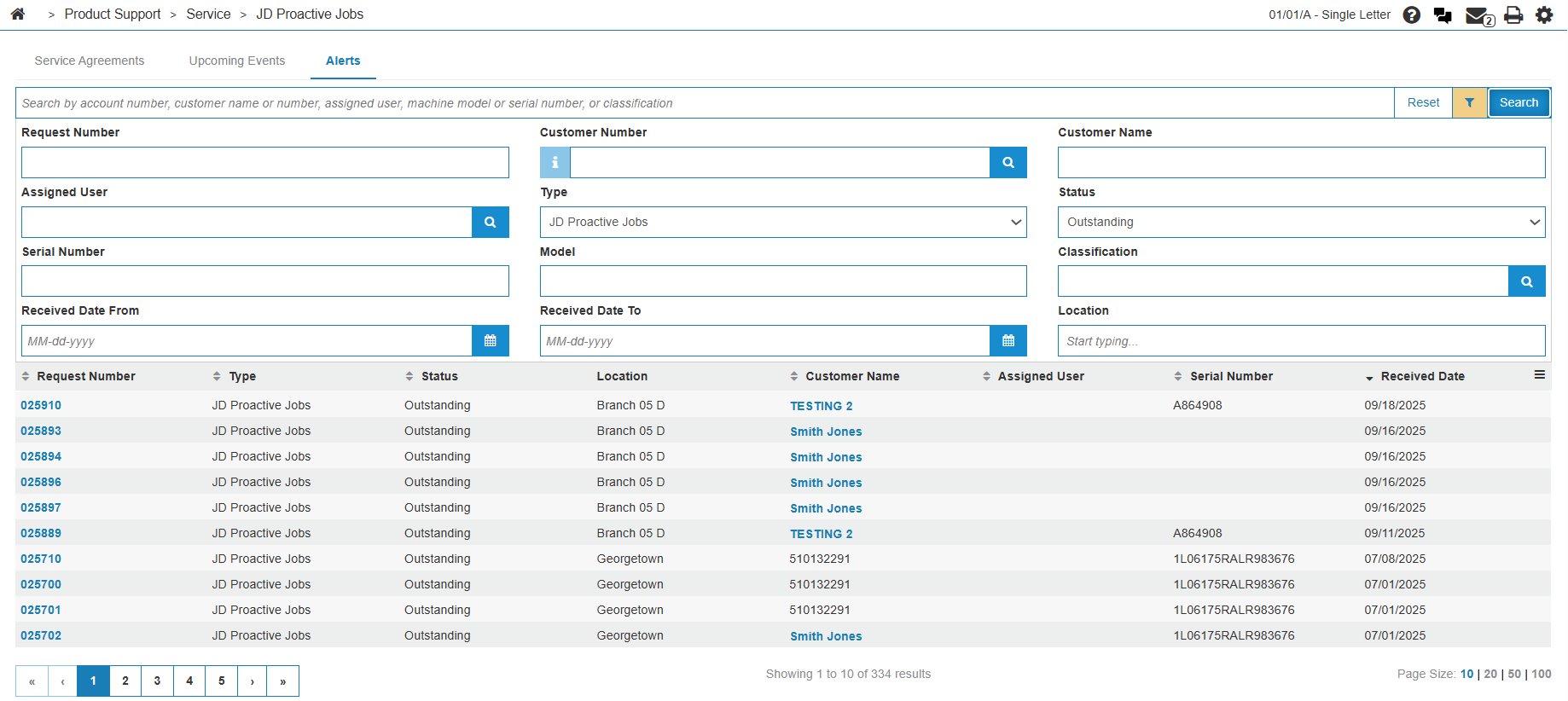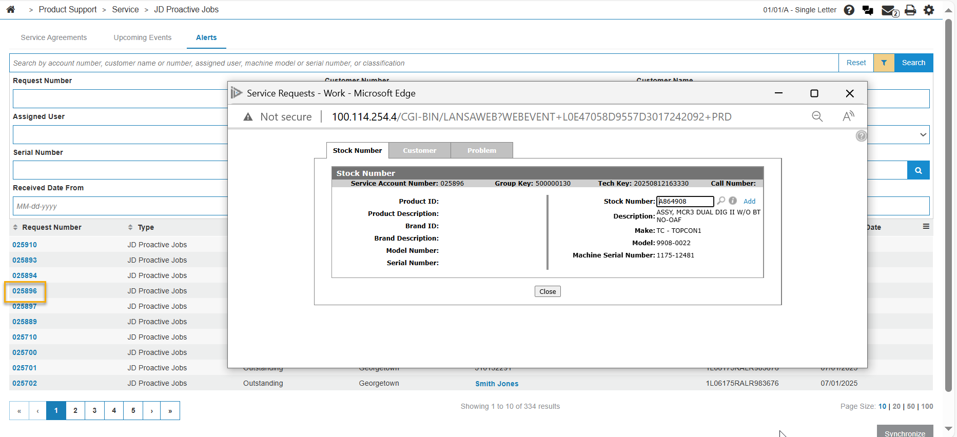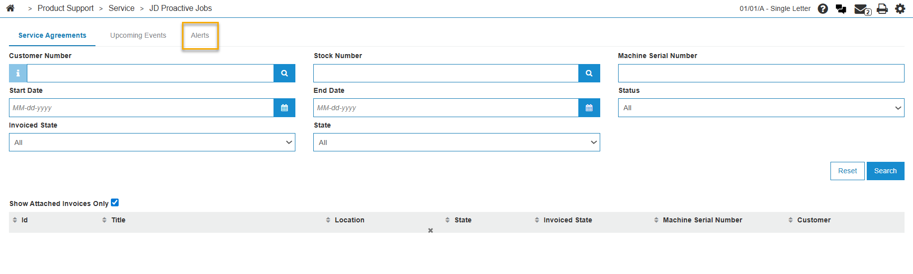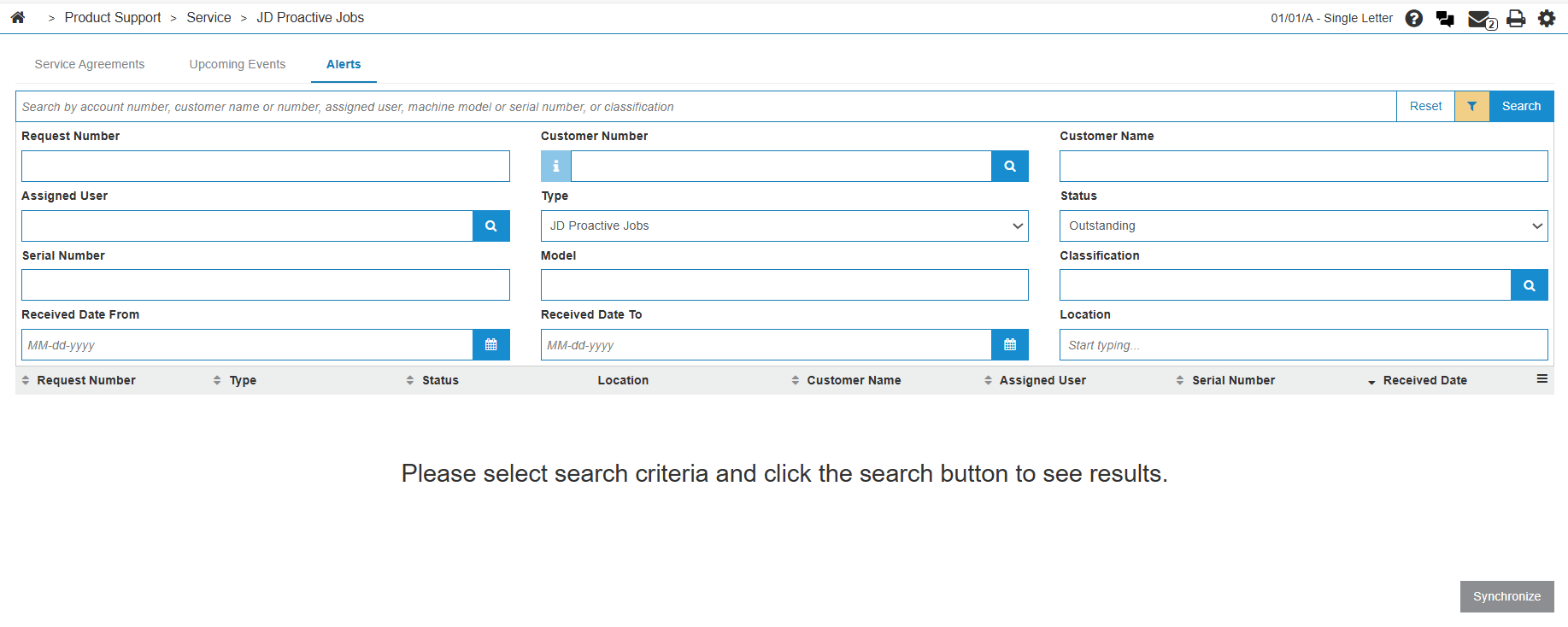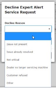 You must have feature PFW.6233 - John Deere SVAP Interface licensed and configured in order to access the Expert Alerts and DTC Interface. Please see the documentation for configuring SVAP if it is not active on your system before proceeding with the Walk through section. Security Switch 810 - Access Service Requests MUST be activated to use the Request Number field in Expert Alerts