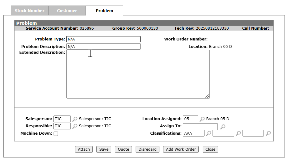 Once the customer number has been assigned, click on the Problem tab. This is where the EAD details will appear. There are optional fields the user can fill in that are not provided by the Expert Alerts and DTC Interface like Salesperson and Assigned To (tech): but if there is not need to enter these, click on Add Work Order to create the work order.