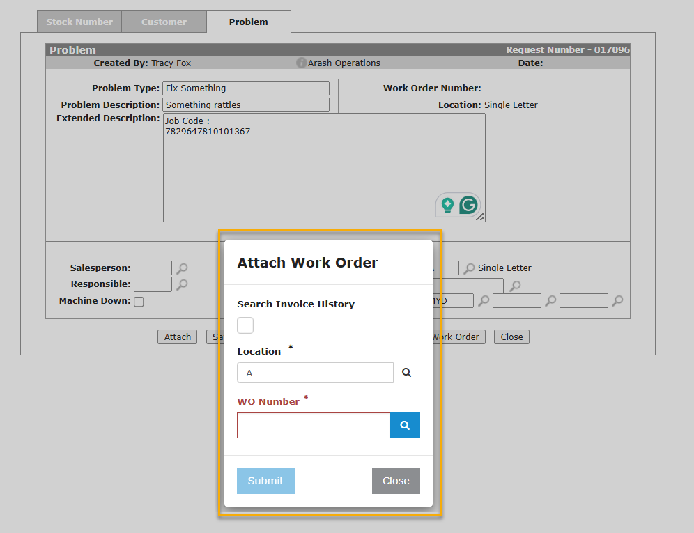 To attach a work order that has been invoiced, first check the "Search Invoice History" checkbox. Next enter the desired work order number in the WO Number field or click on the magnifying glass next to the WO Number field to search for the work order. Once the work order has been selected, click on Submit to attach it to the Service Request.To attach a work order that has not been invoiced, first leave the "Search Invoice History" checkbox unchecked. Next, enter the desired work order number in the WO Number field or click on the magnifying glass next to the WO Number field to search for the work order. Once the work order has been selected, click on Submit to attach it to the Service Request.