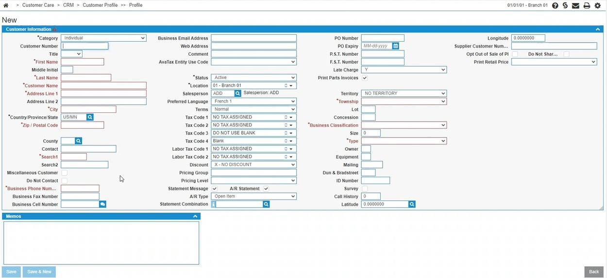 On the Customer - Parts Invoicing Header tab, enter the adjustment Customer Number previously created.