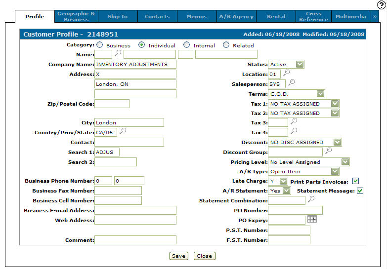 Click the Save button to refresh the Customer - Parts Inventory Header tab with your customers information.