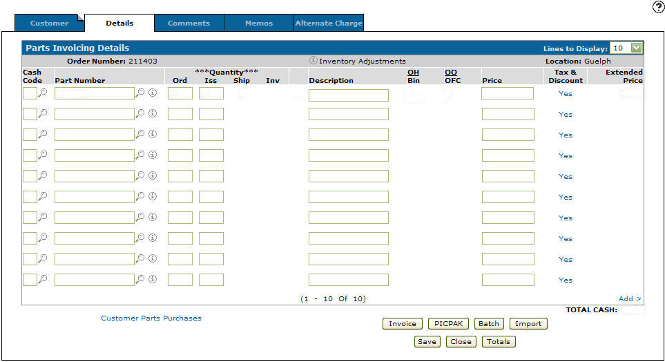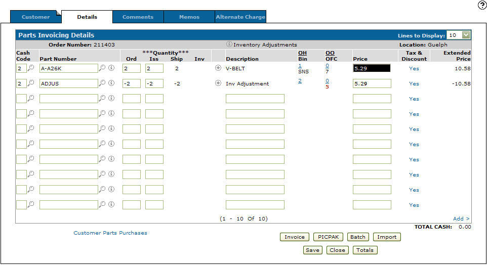 On the Parts Invoicing Details tab, enter cash code 2 (cash) in the Cash Code field.