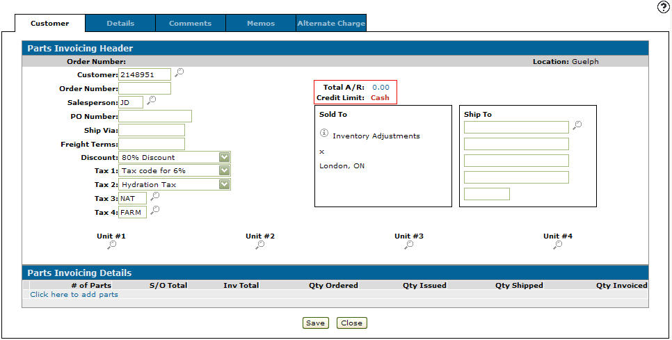 The Customer - Parts Invoicing Header tab well appear.Customer - Parts Invoicing Header tab
