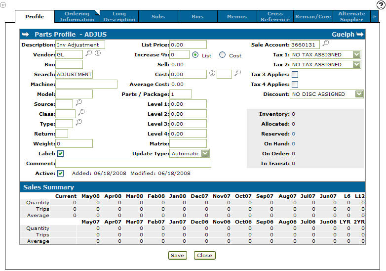 Allows you to view all the adjustments by the purchase history of the customer INVADJD1 or through the parts history screen of the part ADJUST