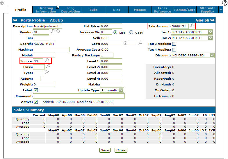 4. You can view all adjustments by either the purchase history of the customer INVADJ01 or through the parts history screen of the part ADJUST.