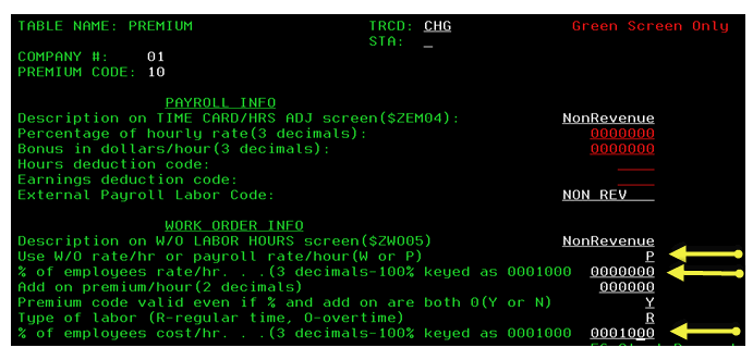 Using premium code 10 as the example. Set to payroll rate (P), and bill out percentage to 0, but 100 % cost