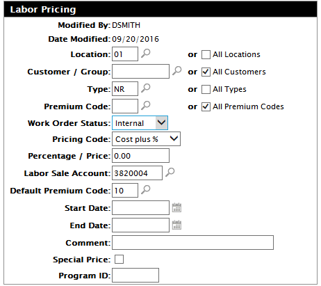 A labor pricing record is required to ensure that the proper sale account, cost of sale account, and premium code are used whenever a non-revenue technician makes a labor entry to a work order.