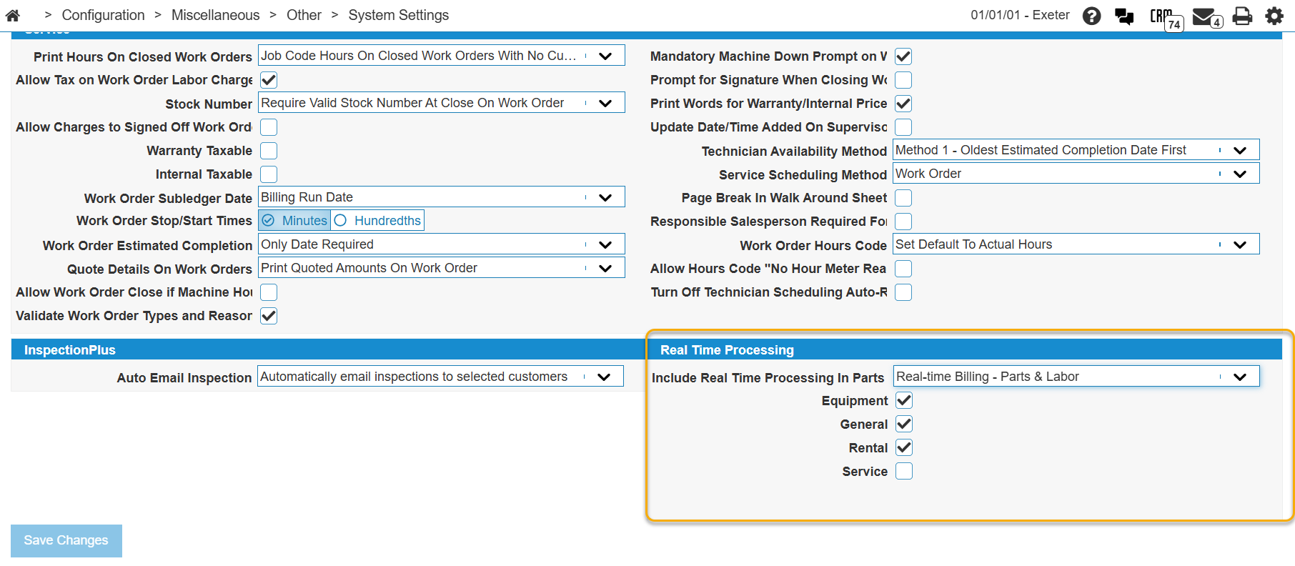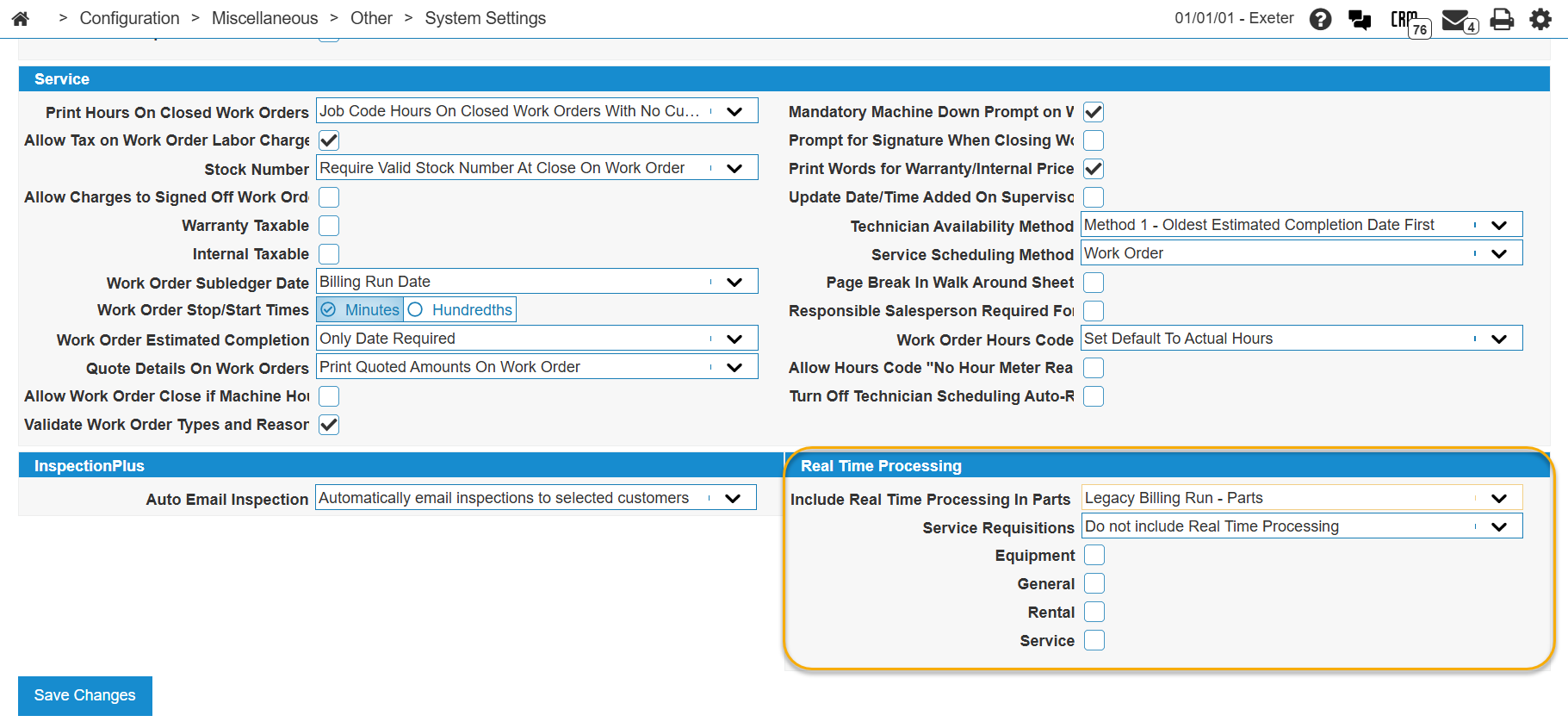 Scroll down to the Real Time Processing section and ensure that no checkboxes are selected. For Parts set Include Real Time Processing in Parts to Legacy Billing Run - Parts and Service Requisitions to Do not include Real Time Processing.