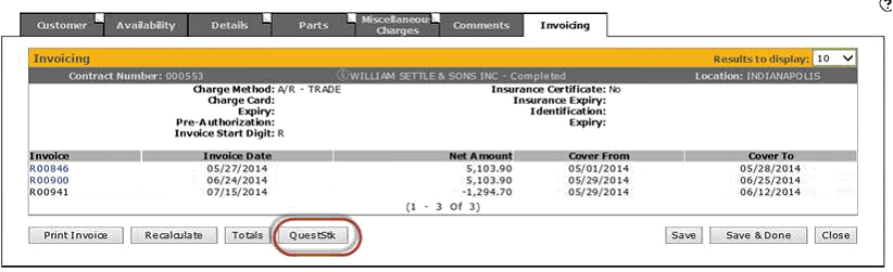 The QUESTSTK utility processing can now be accessed from within the rental counter system, to change an un-posted invoice's stock # to a ? so that it will get through a billing run that has hung up due to the stock # being invoiced status, or perhaps trying to credit more than has been debited to the unit. All you have to do now is go to the invoicing screen for the rental contract in question. After printing the credit invoice, the following QuestStk button will appear: