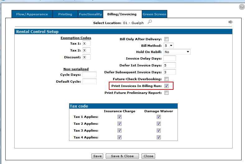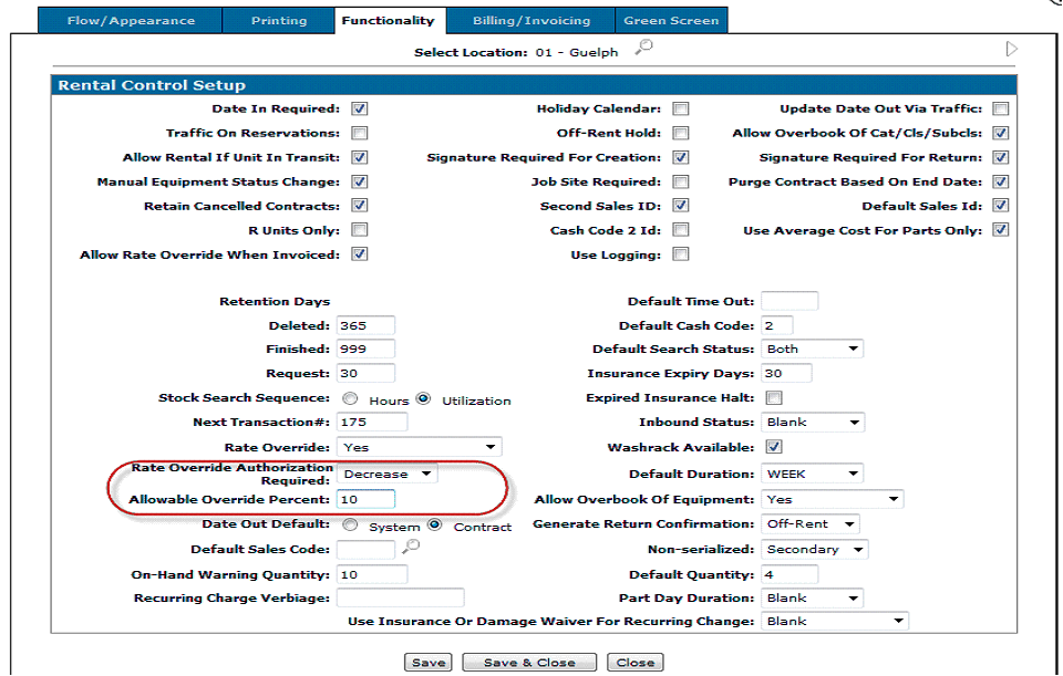 With this box unchecked, the rate override prompt will appear at the time the print invoice option is selected under the invoicing tab of the rental contract.