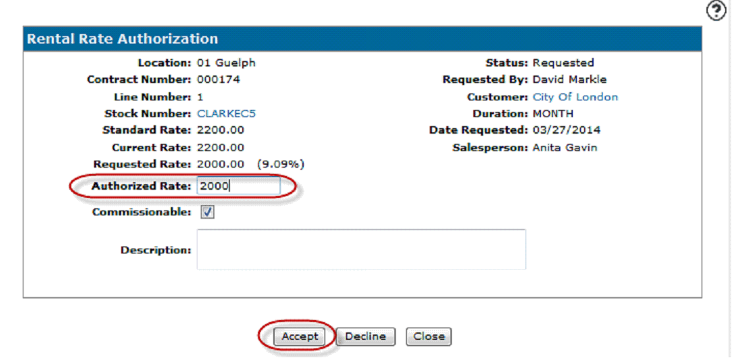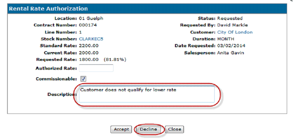 - On the Rental Rate Authorization screen, the manager rejects the request by keying a comment in the Description field and pressing the Decline button