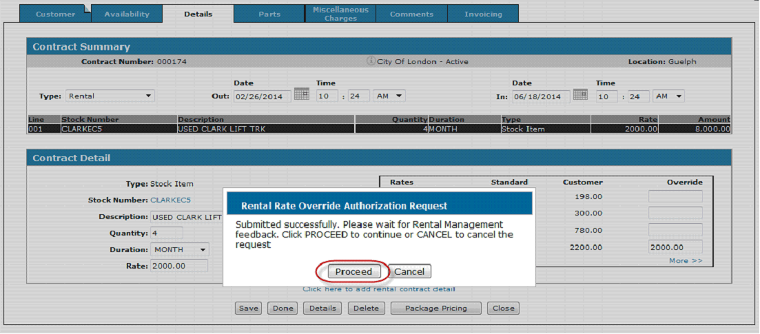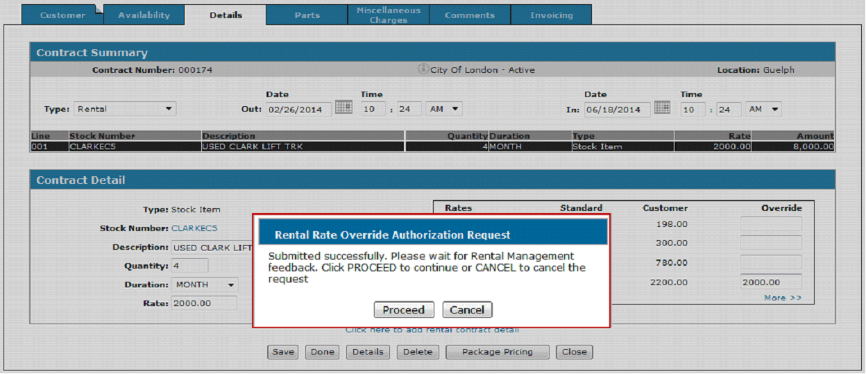 - If the Proceed button is clicked before the request has been approved or rejected, the Rental Rate Override Authorization Request screen will be returned
