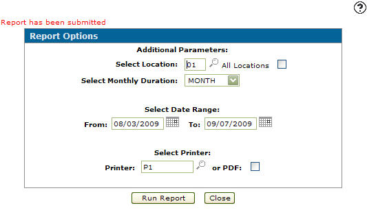 The Report Options screen will indicated that the rental report by location was successfully submitted (RDRPT02).Report Options screen