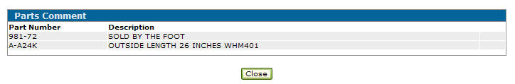 The Parts Comment screen may appear and display the Part Number and Description.The system automatically updates the remaining fields.