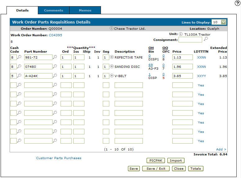 For more detailed information about each column and entry on the Parts Invoicing Details tab, review the IntelliDealer Online Help.