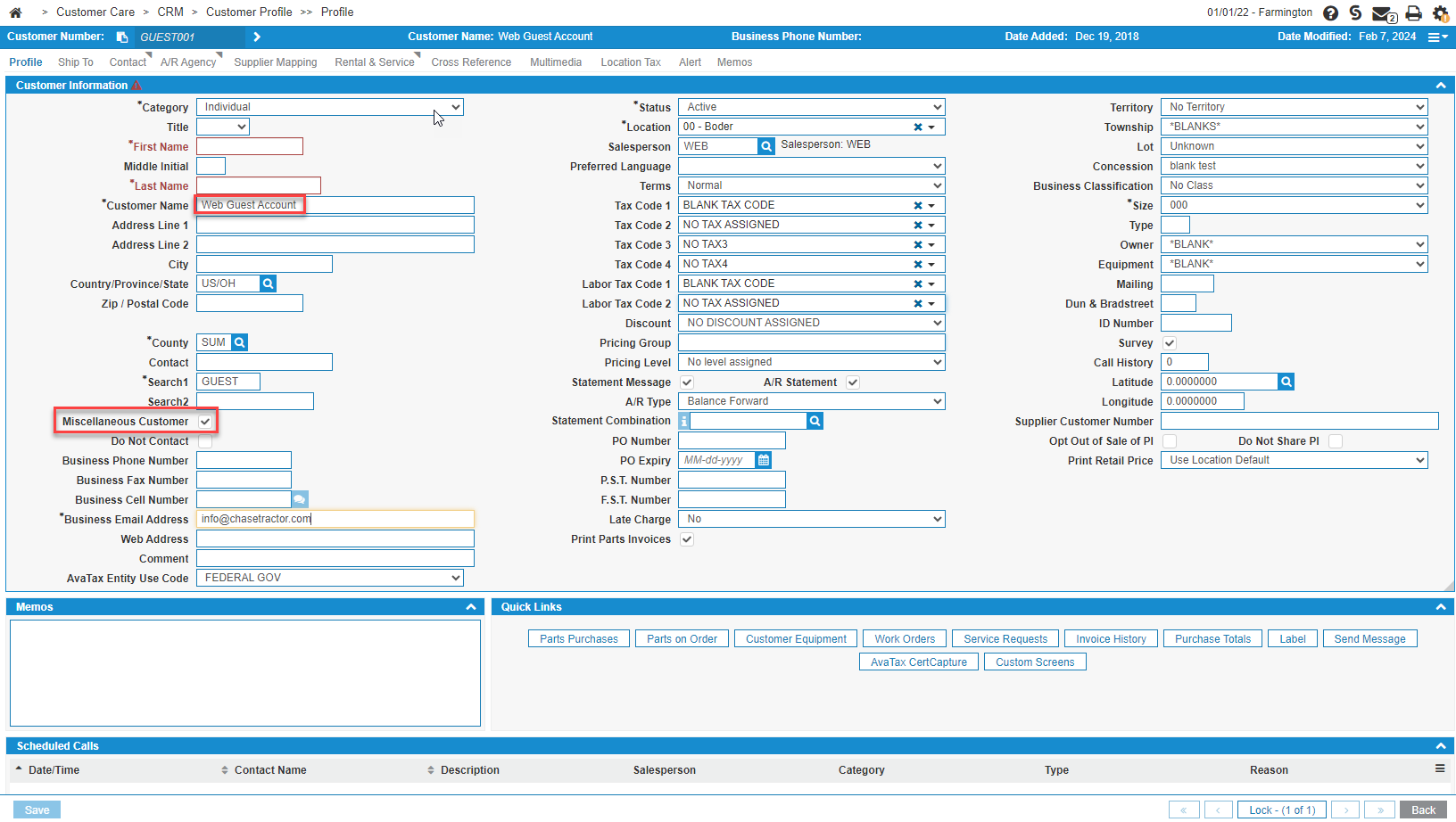 Create a new customer profile to be used for all guest orders. Mark this customer as 'Miscellaneous'. This customer number is used to determine parts pricing (re: Customer Pricing).